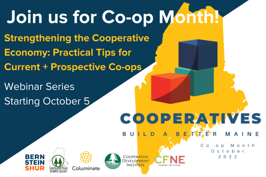 Please join the Cooperative Maine Business Alliance and Bernstein Shur for a joint webinar series to celebrate “Co-op Month” in October.